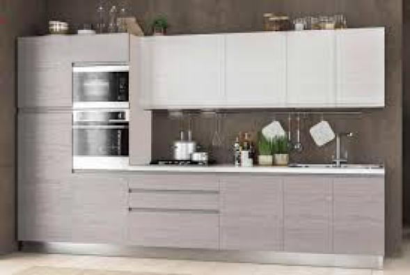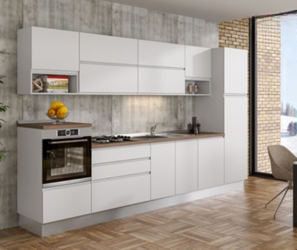 Cucina modello mia di net cucine. Metri 3,60 di lunghezza e metri 2,16 di altezza. Anta con maniglia ad incasso sovrapposta, in MDF spessore 18 con rivestimento in PVC per i colori finitura lucida: bianco, sabbia e tortora; in truciolare con rivestimento in melaminico per i colori finitura legno: rovere grigio, rovere naturale e rovere corda. Possibilità di scegliere il colore del fusto tra grigio perla, bianco e fango. Il top è in laminato spessore 4 o 6 cm con 18 colori a scelta. La disposizione degli elementi è modificabile in base alle vostre esigenze e gusti. La composizione è ampliabile con adeguamento di prezzo. Gli elettrodomestici sono tutti in classe A e potete decidere se montare Candy o Beko allo stesso prezzo. Frigorifero 320 litri, lavastoviglie con comandi a scomparsa, forno inox, piano cottura inox, microonde da incasso, cappa inox, lavello inox 1 vasca con gocciolatoio