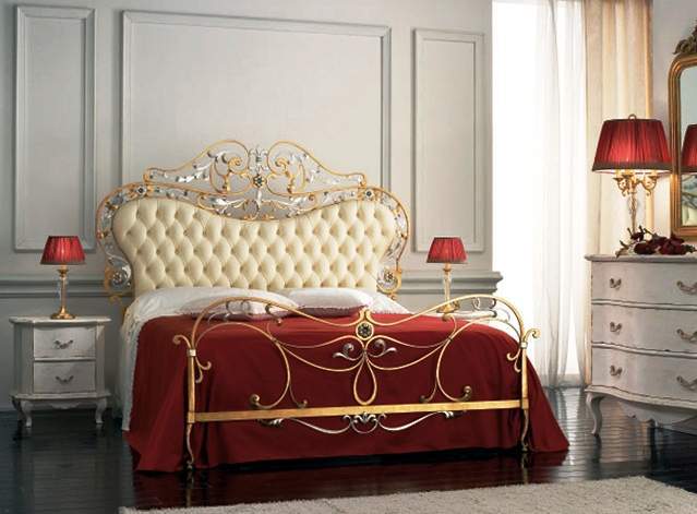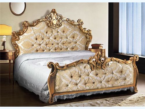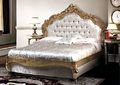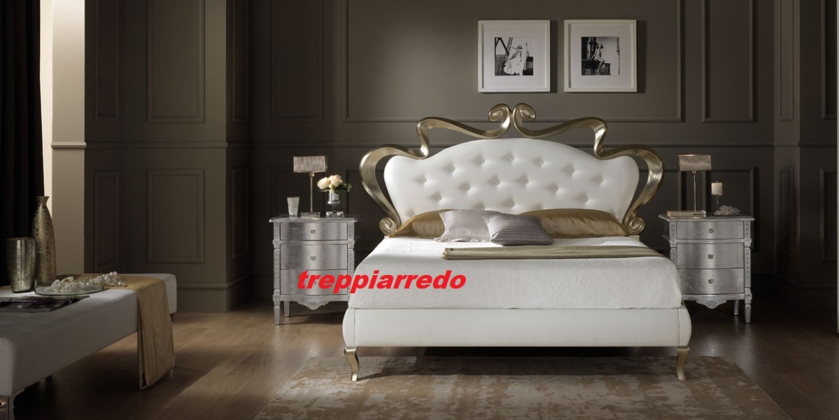 Letto Matrimoniale mod. Caravaggio in legno intagliato oro foglia. Tapezzeria in ecopelle o tessuto.